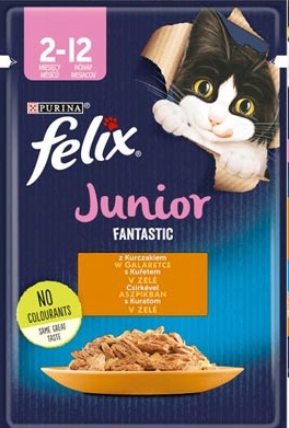 Skład: mięso i produkty pochodzenia zwierzęcego* (20%, w tym kurczak 8%), roślinne ekstrakty białkowe, ryby i produkty rybne, produkty pochodzenia roślinnego, składniki mineralnecukry*kawałki: 50% mięsa i produktów pochodzenia zwierzęcego Analiza składu: wilgotność: 77,5%, białko: 13,5%, tłuszcz surowy: 2,8%, popiół surowy: 2,6%, włókno surowe: 0,8% Dawkowanie: Podawaj w temperaturze pokojowej - zawsze zapewniaj dostęp do świeżej wody do picia kocięciu. Podawaj swojemu kocięciu jedzenie w tym samym miejscu tak, żeby nie był zdezorientowany i nie rozpraszaj go w trakcie jedzenia. Felix Junior jest także odpowiedni dla ciężarnych i karmiących kotek, ponieważ potrzebują one karmy bogatej energetycznie, aby mogły zatroszczyć się o swoje kocięta. Po 12 miesiącach Twoje kocię stanie się dorosłym kotem gotowym do wypróbowania pysznej gamy produktów Felix Fantastic. Wiek 8-12 tygodni 1¼ do 4 w 2 - 3 posiłkach lub według upodobań Wiek 12-26 tygodni 2⅓ do 5 ¼ w 2 posiłkach lub według upodobań Wiek 26-52 tygodni 5¼ do 2½ w 2 posiłkach lub według upodobań. Ciężarne i karmiące kotki: powinny otrzymać tyle karmy, ile potrafią zjeść.