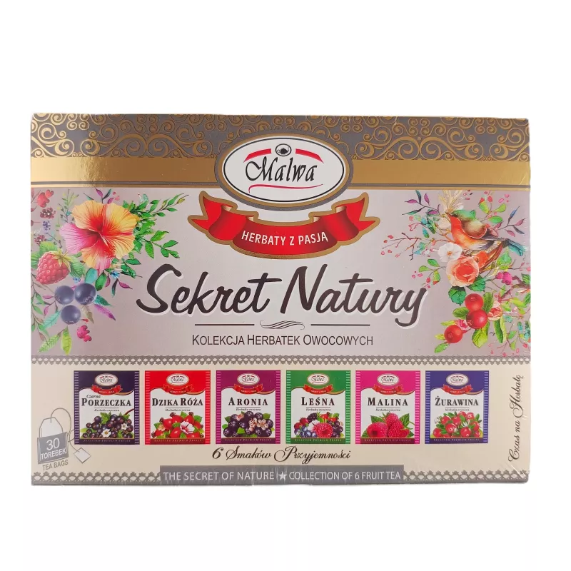 Malwa Sekret Natury – odkryj bogactwo smaków natury w jednym zestawie! 6 wyjątkowych herbat owocowych, takich jak malina, aronia czy dzika róża, dostarczy Ci niezapomnianych doznań smakowych. Każda torebka to podróż w świat aromatycznych owoców i ziół, które zadbają o Twoje zdrowie i samopoczucie.