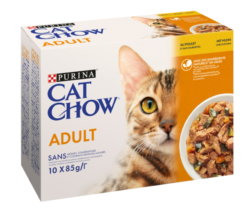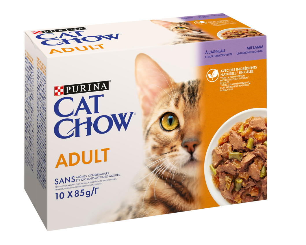 Purina Cat Chow Adult jagnięcina 10x85g Pełnoporcjowa karma dla dorosłych kotów Zbilansowana mokra karma dla dorosłych kotów jagnięcina z zielonym groszkiem. Mokra karma Purina Cat Chow bez dodatku sztucznych barwników, aromatów i konserwantów. Przygotowanie i stosowanie Zalecenia żywieniowe: Kotu o wadze 4 kg podawaj 3 do 4 saszetek dziennie w co najmniej 2 oddzielnych posiłkach. Indywidualne zapotrzebowanie może się różnić, a ilość podawanej karmy powinna być odpowiednio dostosowana, aby utrzymać prawidłową masę ciała Twojego kota. Podawać w temperaturze pokojowej. Zapewnij kotu stały dostęp do świeżej i czystej wody do picia. Przechowywanie Produkt powinien być przechowywany w chłodnym i suchym miejscu. Składniki: mięso i produkty pochodzenia zwierzęcego (w tym jagnięcina* 4%), roślinne ekstrakty białkowe, ryby i produkty rybne*, składniki mineralne, warzywa* (0.8% odwodnionej zielonej fasoli, odpowiednik 7% zielonej fasoli), cukry, drożdże*. *naturalne składniki.